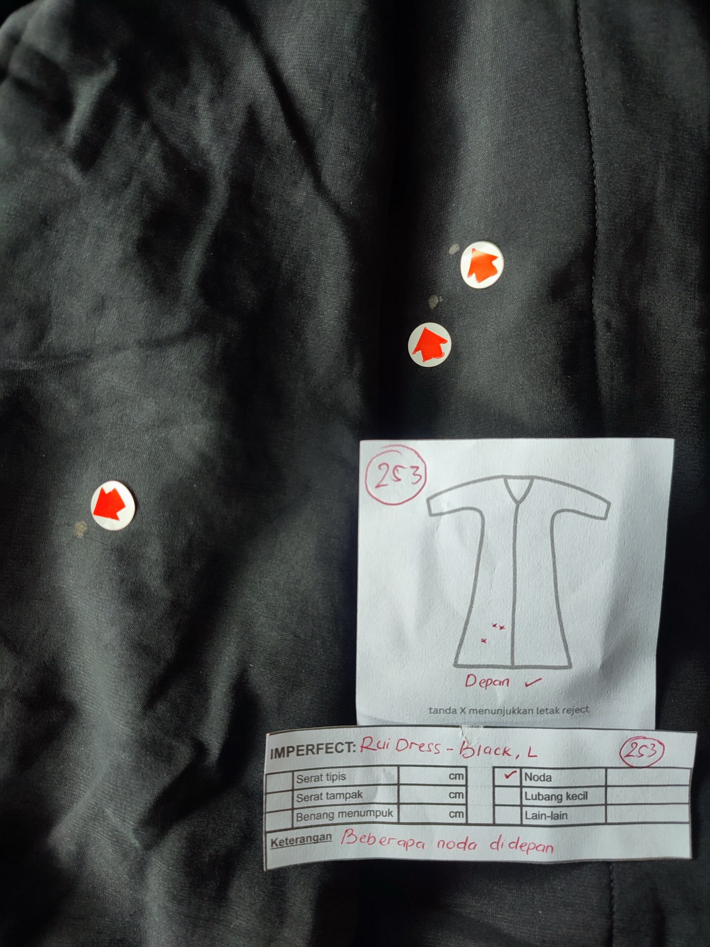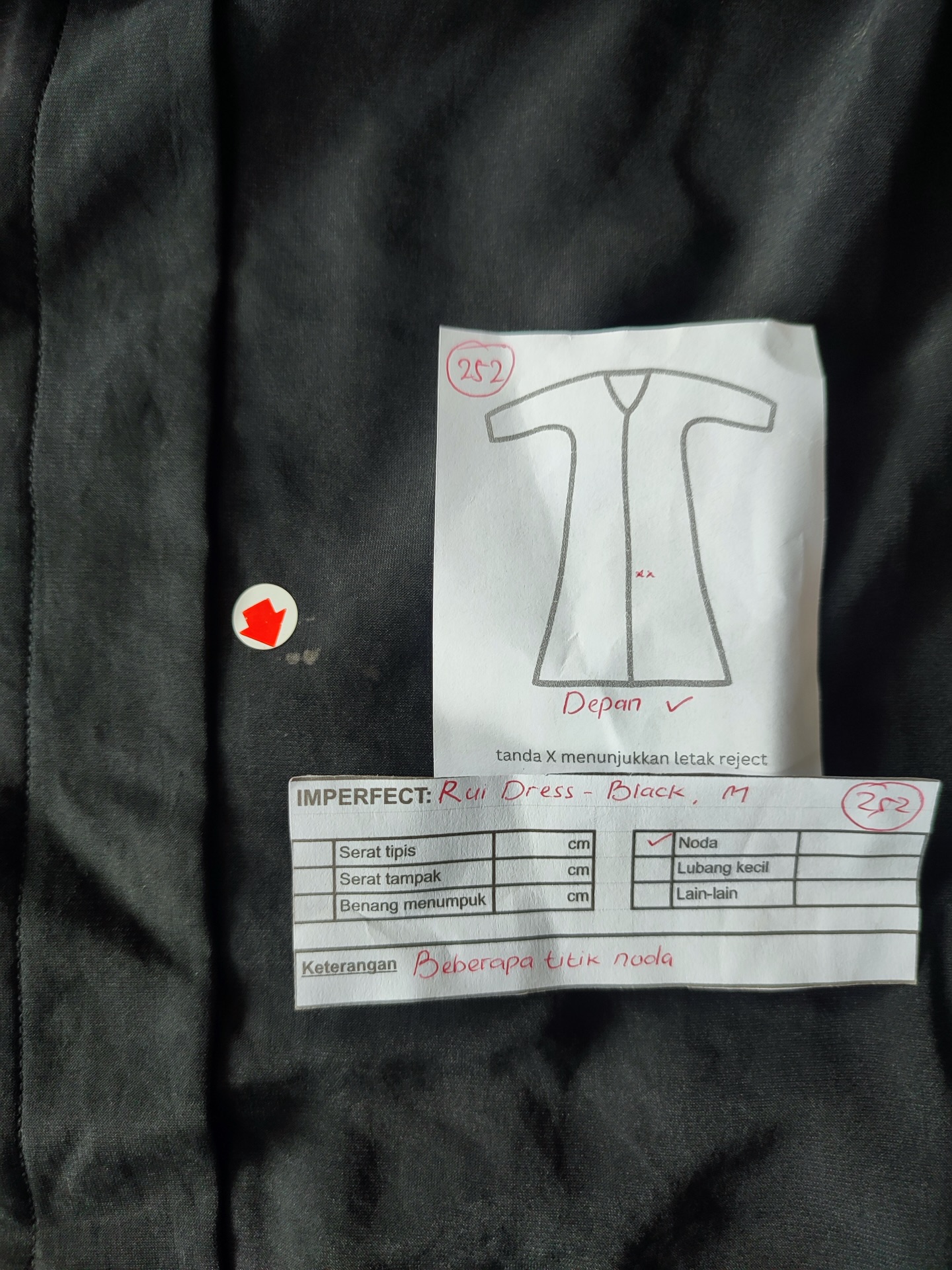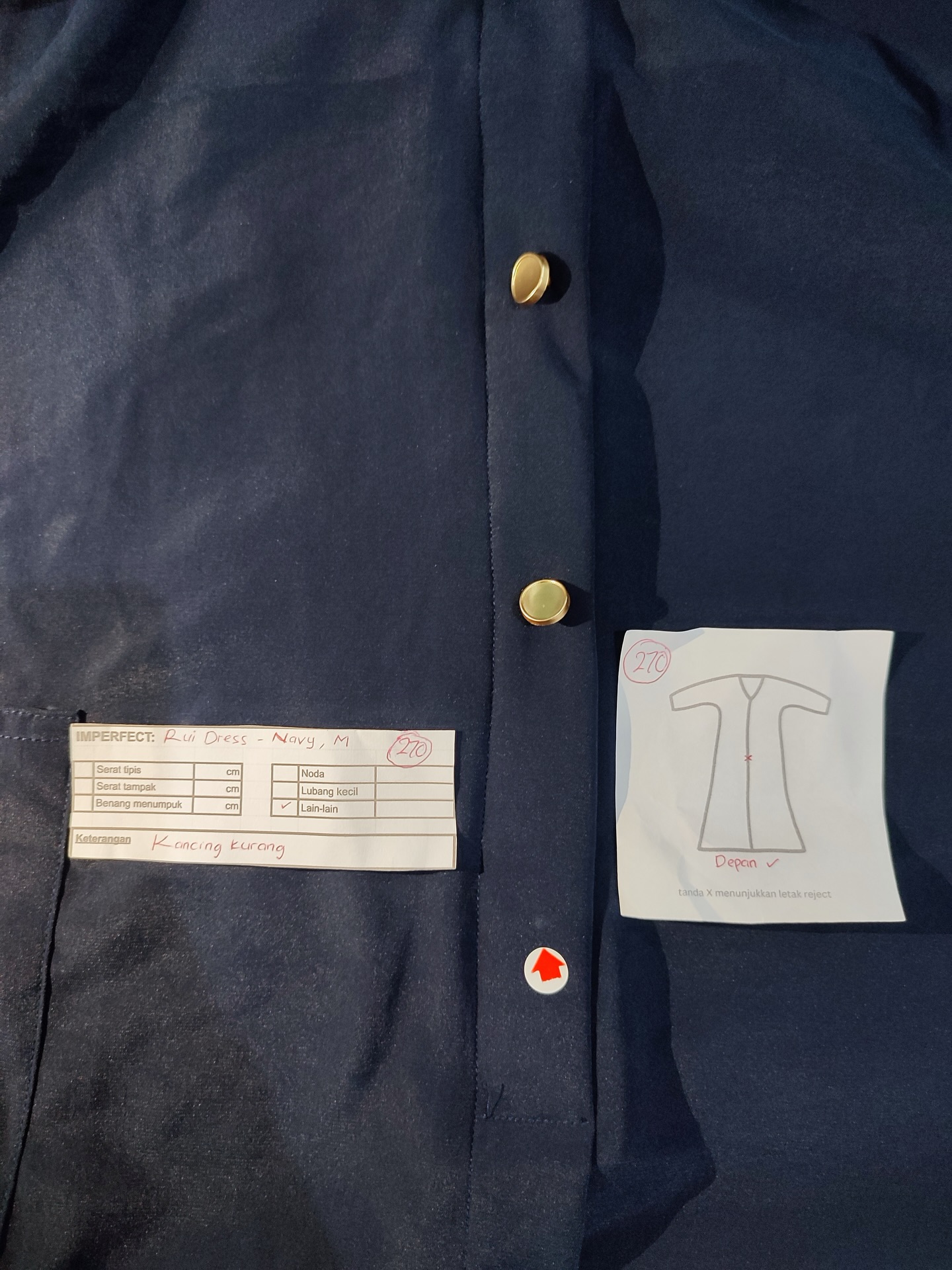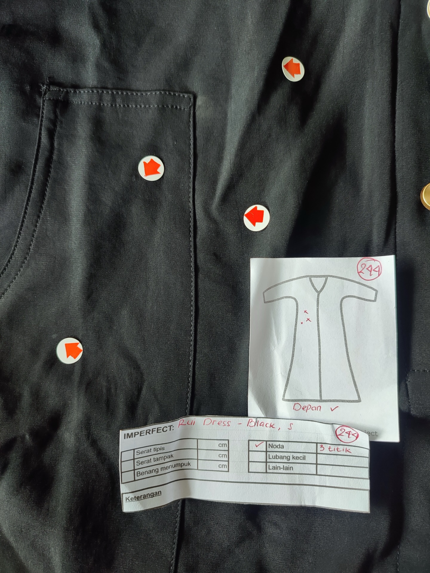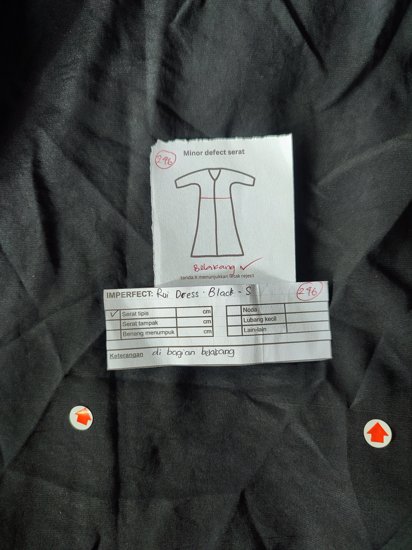 photo includes code, color, size, and defect details.